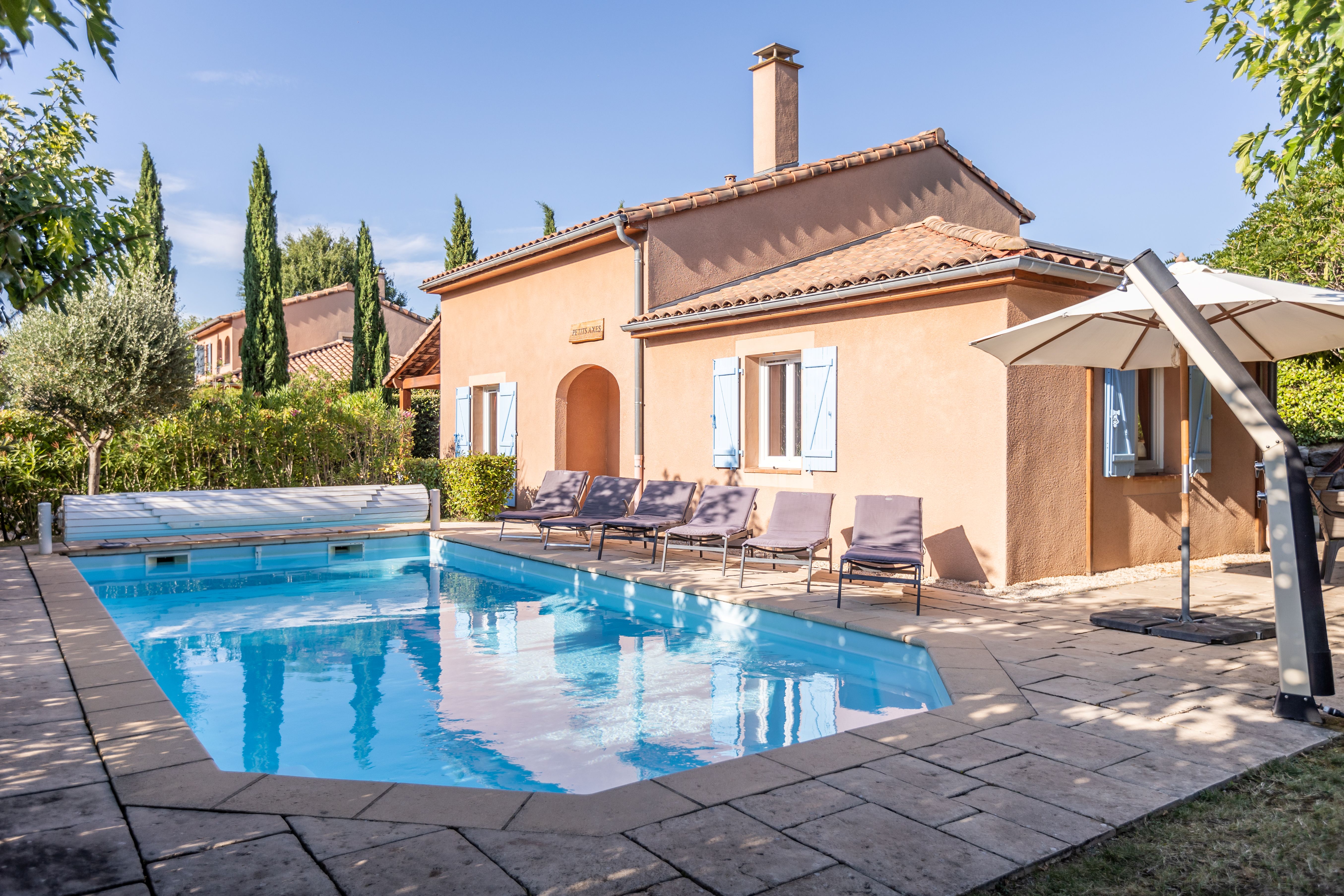 De vakantiewoning "Petits Axes" is rustig gelegen. De tuin heeft alle privacy en is voorzien van een door de zon verwarmd privé zwembad met een elektrisch bedienbaar roldek en een buitendouche. Laadpaal aanwezig (Mono phase - type 2 aansluiting; max. laadsnelheid 7.2 kwh.).